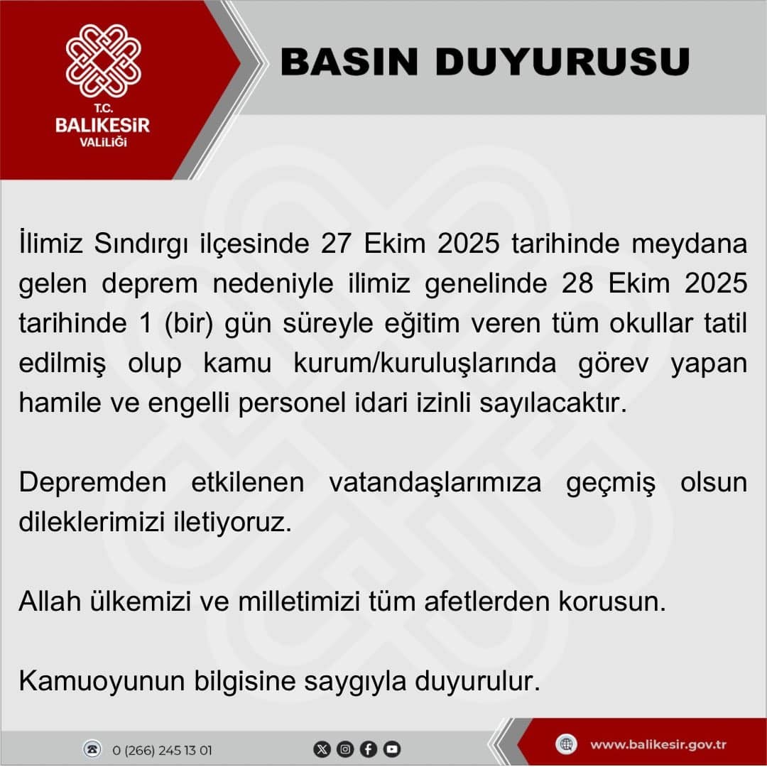 Balıkesir Valiliği, Sındırgı ilçesinde yaşanan 6.1 şiddetindeki depremin ardından, il genelindeki okulların 1 gün süreyle tatil edildiğini duyurdu.