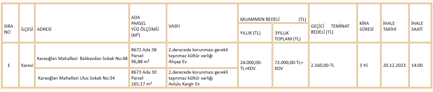 İdaremiz tasarruf ve sorumluluğundaki Karesi İlçesi Karaoğlan Mahallesi 8672 ada 38 parsel üzerinde Balıkavdan Sokak No:48 adresindeki taşınmaz ile Karesi İlçesi Karaoğlan Mahallesi 8673 ada 30 parsel üzerinde Ulus Sokak No:34 adresindeki aşağıda muhammen bedeli, geçici teminatı, ihale tarihi, ihale saati, kiralama süresi belirtilen taşınmazların 2886 sayılı Devlet İhale Kanununun 45. maddesine göre şartname esasları dahilinde Açık Teklif Usulü arttırma sureti ile kiralama ihalesi yapılacaktır.